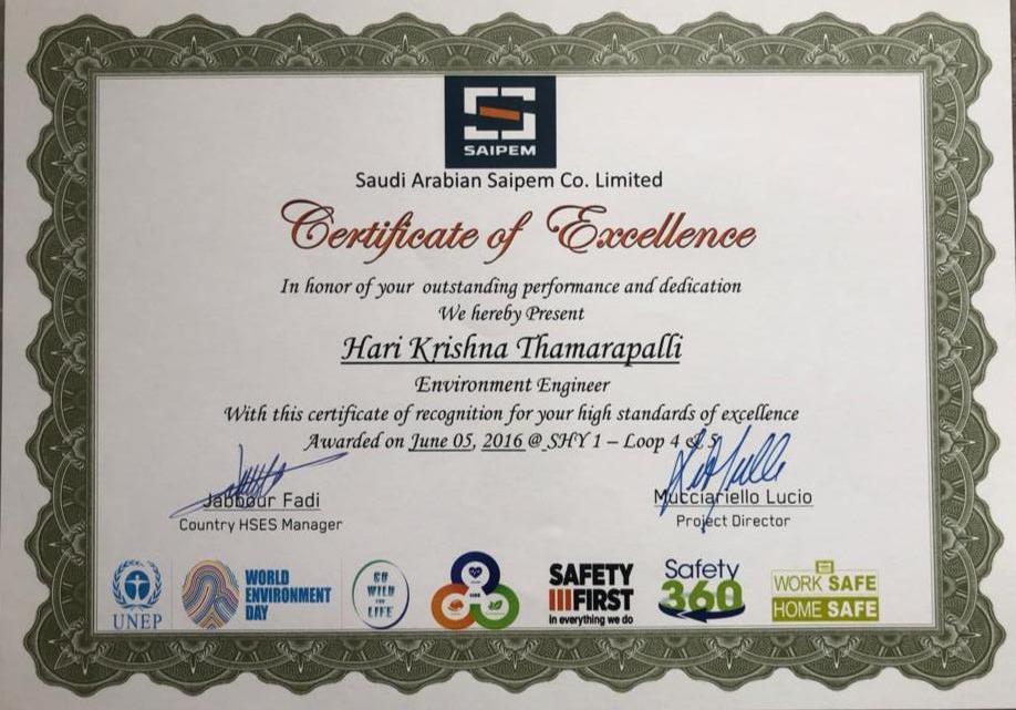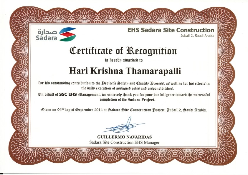 Hari Thamarapalli was a dedicated member of my team during my time as Project HSE Manager in the Hawiyah Gas Plant Expansion Project in the eastern part of Saudi Arabia. Hari is vested with indepth knowledge of the Environmental Safety Management requirements and his implementation of same is on a high level. He is a capable, goal focused, hard-working, and result oriented professional. His social, technical skills, attention to details and team spirit are additional attributes that distinguished Hari as an outstanding support for the achievement of project and company goals. Hari comes highly recommended by me for an Environmental Managerial position.