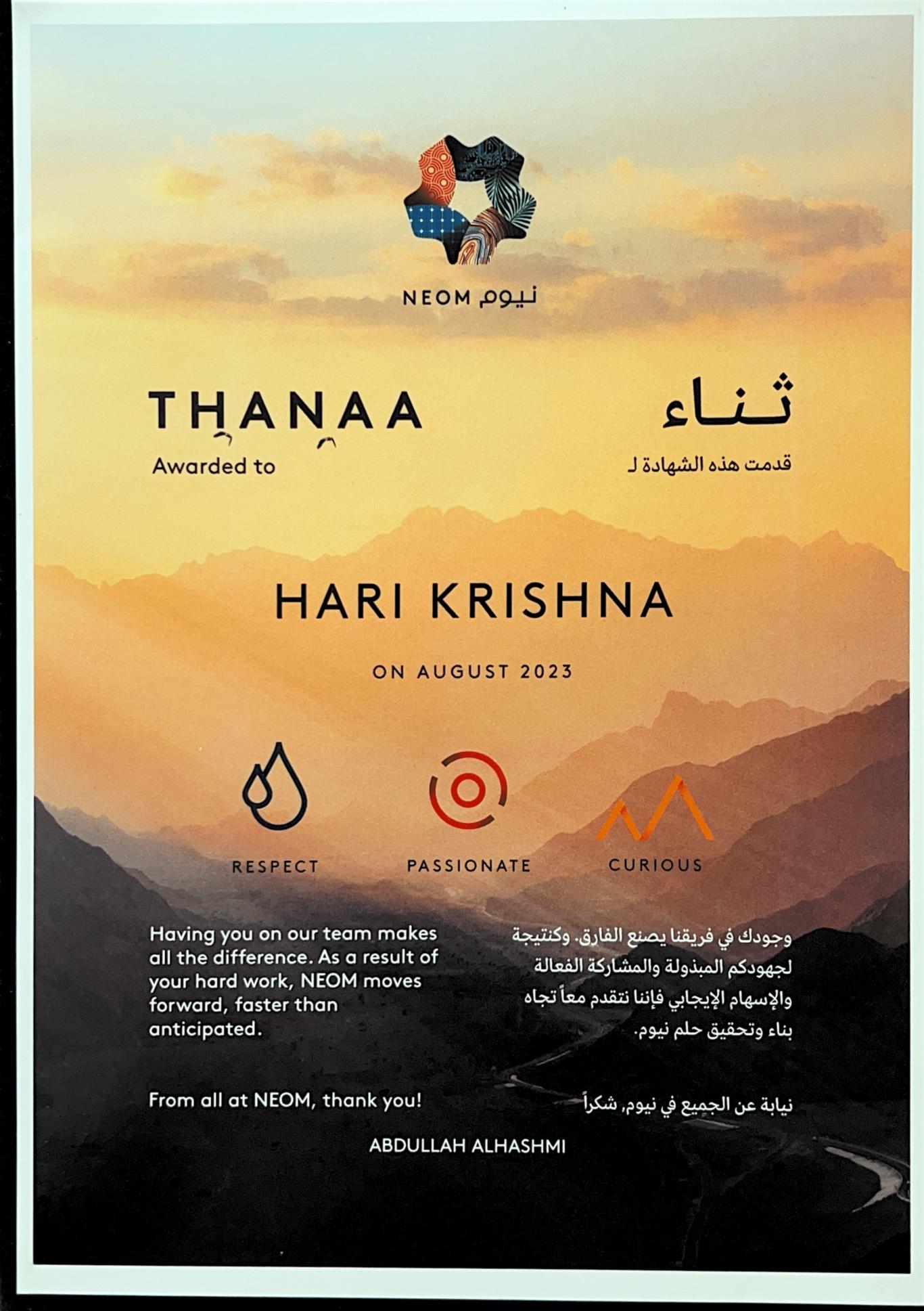 NEOM Thaana Award : Recognized for leadership in waste management and municipal operations supporting large-scale project execution.
